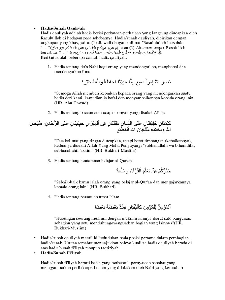 Sebagai sumber hukum tentu saja hadits berperan dalam menggali hukum-hukum agama islam yang dijadikan patokan pedoman dan. Analisis Terhadap Kualitas Sanad Hadis Qauliyah Filiyah dan Taqririyah Aifa Nur Amalia Imam MuslimPeriwayat ke-6 Mukharijul-HadisBerikut merupakan biografi para perawi hadis yang diriwayatkan oleh Hijriah dan meninggal dunia pada sore hari Ahad bulan Rajab tahun 261 Hijriah dan dikuburkan di. Yang dimaksud dengan hadist Qauli ialah segala bentuk perkataan atau ucapan yang disandarkan kepada Nabi SAW.