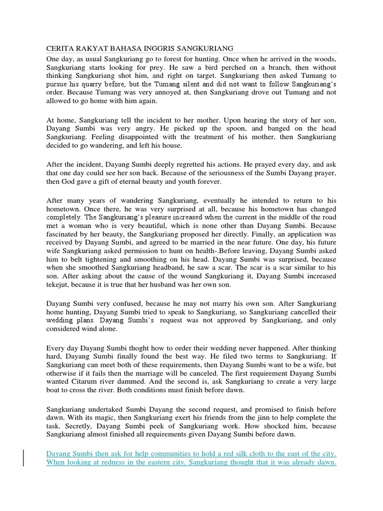Contoh Cerita Sangkuriang Dalam Bahasa Inggris dan Artinya Secara Sederhana. Cerita Rakyat Dalam Bahasa Inggris Sangkuriang. Saat memakanya Dayang Sumbi teringat pada Tumang dan menanyakannya pada Sangkuriang Sangkuriang menjawab dengan wajah ketakutan Tumang mati Dayang Sumbi marah bukan dan memukul kepala Sangkuriang dengan sendok nasi dan.